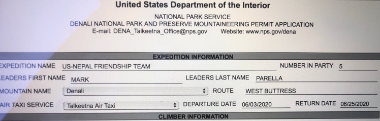 I have applied for the climbing permit for Denali under the decided team name being “US-Nepal Friendship Team”. Climbing permits this year are $375 per person. Once all members of the team have applied and paid for their permits we will set up a orientation appointment with the rangers at the Talkeetna Ranger Station, which we will attend just prior to our flight from Talkeetna onto the glacier.