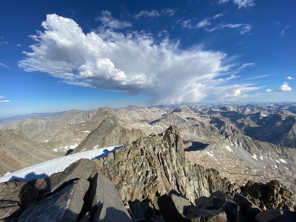 We found a sandy patch with a nicely slanted rock to lay our backs against at the base of the pass to bivouac. Everyone donned all their clothes and found ways to retain as much heat as possible, as the temperature started falling. Tony and Ben even emptied their backpacks and pulled them up over their legs to keep their feet and legs warm. That night temps fell to right around freezing. I realized when I saw thin layers of ice on the streams in the morning. It was a cold uncomfortable night, but we survived and all got some rest. Upon first light we found our way over the pass. What laid before was was two miles of slabs, boulder fields, snow fields, and moraines to get up and over Thunderbolt Pass. Even with the rigorous hiking, it was enjoyable. The hike passed the entire traverse to the east that we had just scaled. Sheer granite walls shot up to the sky and the landscape was littered with massive boulders that appeared to be thrown down from the peaks above. Looking up at the granite spires and deep chutes gouged out between the peaks, I was in awe with what we had just done. Within four hours we were up and over Thunderbolt Pass and in another thirty minutes back down at our camp. After packing up and eating our snacks, it was time to head home. After hiking a little cross country up to Bishop Pass we were back onto a maintained trail. From there our hike out was peaceful. The trail wound around lakes and along the base of peaks on each side. A thunder shower came through and cooled off the mid day heat. There was little talk on the hike out as we all reflected on our epic adventure.