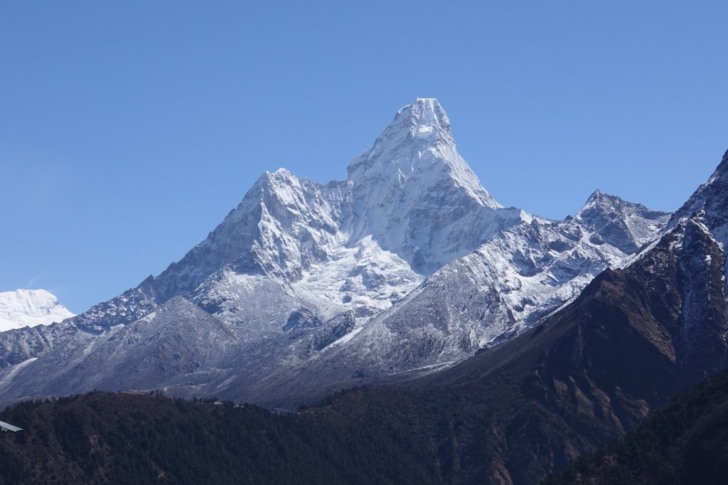 Ama Dablam is known as one of the world’s most beautiful mountains in the eastern Himalayan range. The main peak is 6,812 meters (22,349 ft). With its prominent ridges and steep faces Ama Dablam is sometimes referred as the Matterhorn of the Himalayas. Ama Dablam means “Mother’s necklace” because of the long ridges on each side like the arms of a mother (ama) protecting her child, and the hanging glacier thought of as the dablam, the traditional double-pendant containing pictures of the gods, worn by Sherpa women.